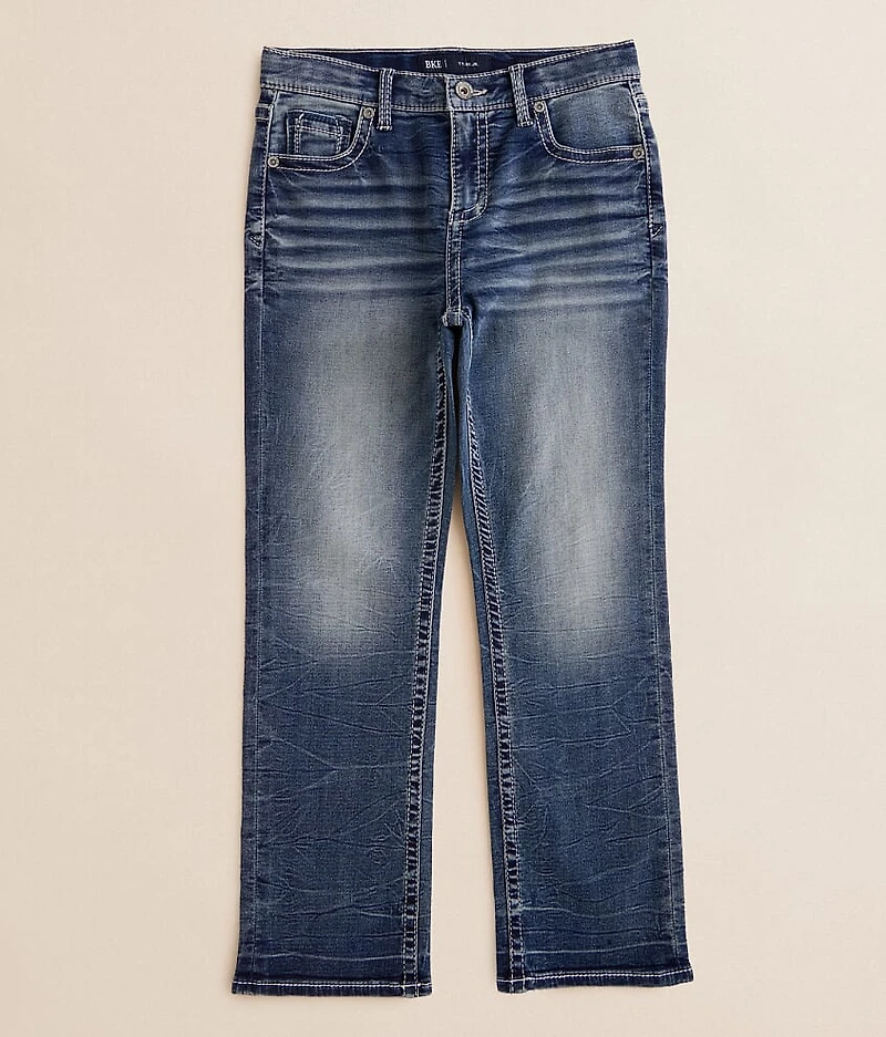 Relaxed fit knit jean Superior stretch fabric, our highest level of stretch for ultimate movement Short inseam measures 25" on size 12 and will grade accordingly to size Regular inseam measures 27" on size 12 and will grade accordingly to size Tall inseam measures 29" on size 12 and will grade accordingly to size Straight from knee to hem Adjustable waistband Mid-rise, 15" bottom opening Zip fly Size 4-8 has a snap closure Fit Note : Tyler Jr. was previously the Relaxed Straight fit