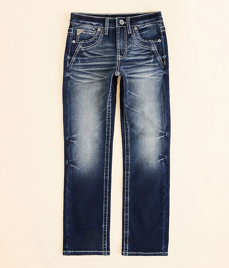 Regular fit jean Superior stretch fabric, our highest level of stretch for ultimate movement Regular inseam measures 27" on size 12 and will grade accordingly to size Tall inseam measures 29" on size 12 and will grade accordingly to size Straight from knee to hem Adjustable waistband Mid-rise, 14" bottom opening Color pop stitch embroidery on pieced faux flap back pockets Hand sanding, whiskering, veining and grinding details Zip fly Sizes 4-6 have a snap closure Matching men's jean