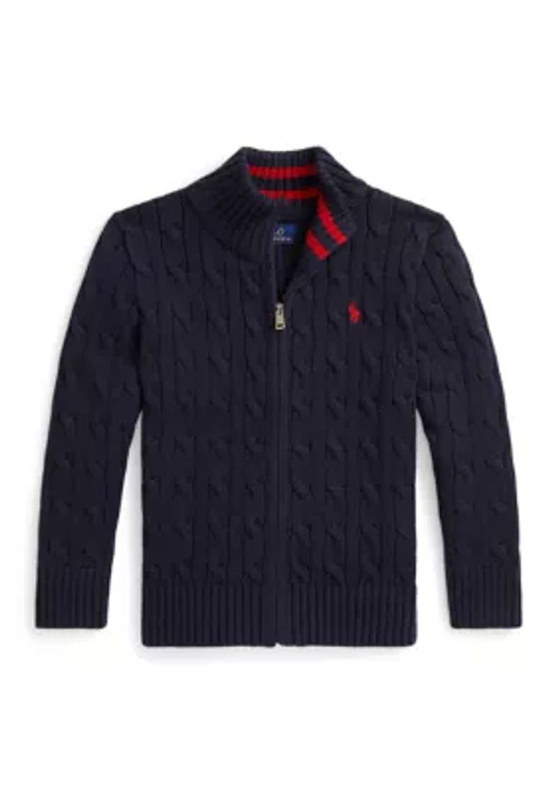 Perfect for when temperatures dip, this full-zip sweater from Ralph Lauren Childrenswear unites their signature cable-knit design with soft combed cotton. 100% cotton. Machine washable. Size 4 has a 16" body length (front and back) and a 14" sleeve length. Signature embroidered Pony at the left chest. Rib-knit mock neck with striped facing. Full-zip front. Zipper pulls custom-developed with a “Polo” logo. Long sleeves with rib-knit cuffs. Rib-knit hem. Imported. 100% cotton.