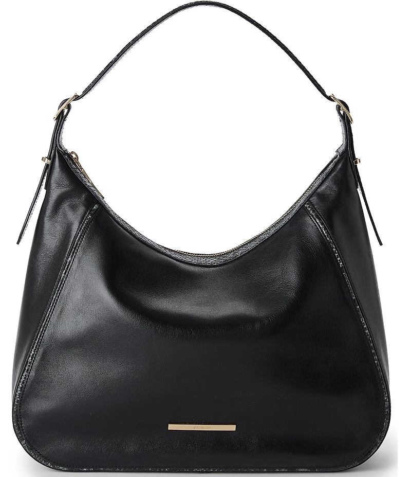 From BRAHMIN, this hobo shoulder bag features: Black smooth leather, black snake leather trim Zip closure Adjustable strap Interior kangaroo and zipper pockets Key clip Approx. 15" L x 10" H x 3.5" W Approx. 1.5 lbs Imported.
