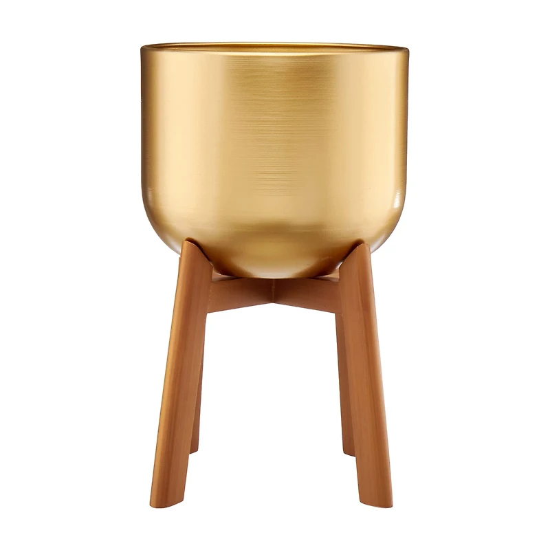 Elevate your greenery with the sophisticated charm of our Brass Garden Planter with Stand. This stunning planter combines modern elegance with rustic warmth, making it a perfect addition to any indoor or outdoor space. Crafted with a lustrous brass finish, the planter exudes a luxurious feel that beautifully complements the vibrant hues of your favorite plants. The sleek, cylindrical design offers ample space for a variety of plant types, from lush ferns to vibrant flowers, ensuring they have room to thrive. The planter is paired with a sturdy wooden stand that adds a touch of natural appeal. The stand's clean lines and warm wooden tones provide a striking contrast to the gleaming brass, creating a balanced and stylish look. The stand elevates the planter, allowing for better air circulation around your plants and making it easier to display them at eye level. Measuring approximately 18 inches in height, this planter and stand set is perfect for adding a touch of greenery to your living room, patio, entryway, or office. The durable materials ensure long-lasting use, and the minimalist design allows it to blend seamlessly with any decor style, from contemporary to bohemian. Whether you're an experienced gardener or just starting, the Brass Garden Planter with Stand from pOpshelf is an elegant and practical choice. It’s not just a planter; it’s a statement piece that brings life and beauty to any space.