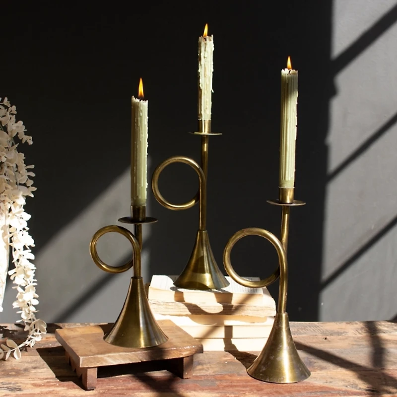 Brass Trumpet Taper Candle Holders, Set of 3