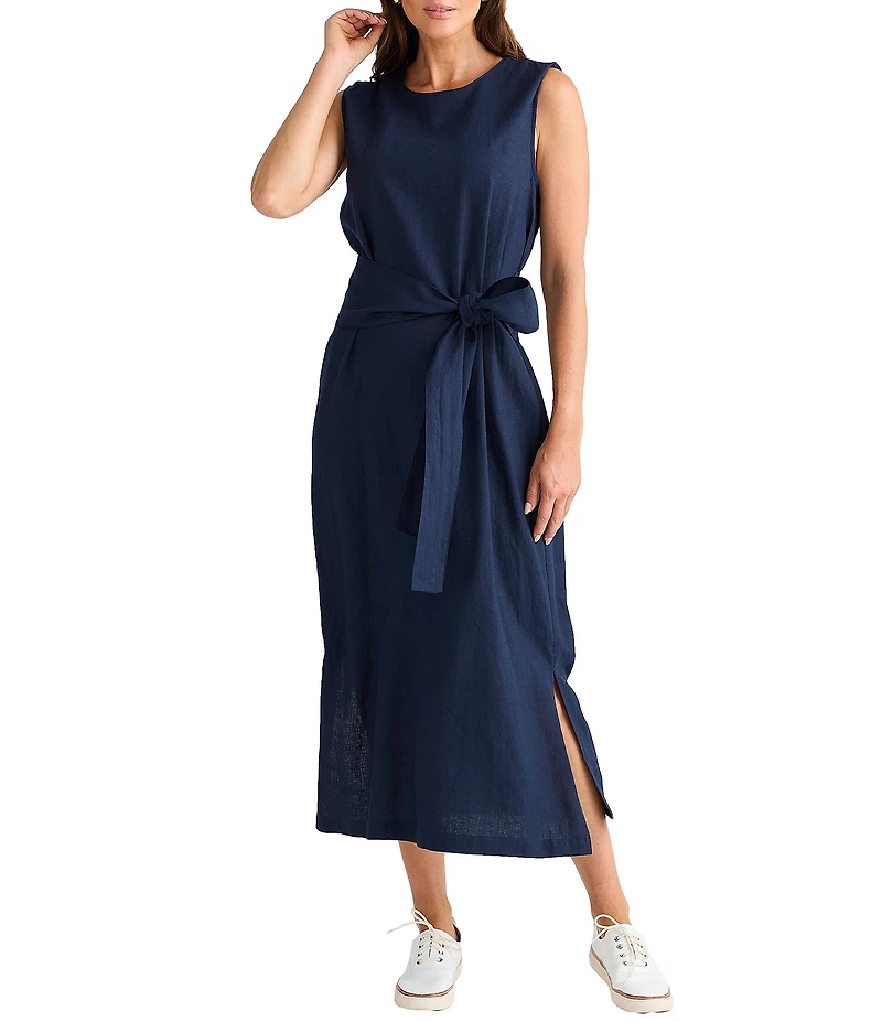 Brave + True Linen Blend Sleeveless Tie Front Smocked Back Midi Dress