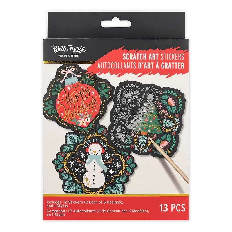 Have fun revealing holiday motif designs with this Brea Reese scratch art sticker kit. Featuring swirls of shimmering metallic and bursts of color, these scratch art patterns will quickly reveal incredible images through a guided illustration that’s easy to follow. Follow the outlines to reveal the art beneath—you can scratch off the top layer to reveal as much or as little of the design as you like. Then, pull the sticker from the backing and apply to Christmas cards, gift boxes or gift bags.Details:Includes assorted designs13 piecesConforms to ASTM D-4236Contents:12 stickers (2 each of 6 designs)1 stylus