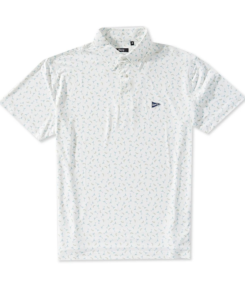 From Breezy, this shirt features: Allover print Polo collar Short sleeves 3-button placket closure Logo on the left chest 4-way stretch Moisture wicking Pullover construction UPF 50+ protection Polyester/spandex Machine wash/tumble dry Imported.