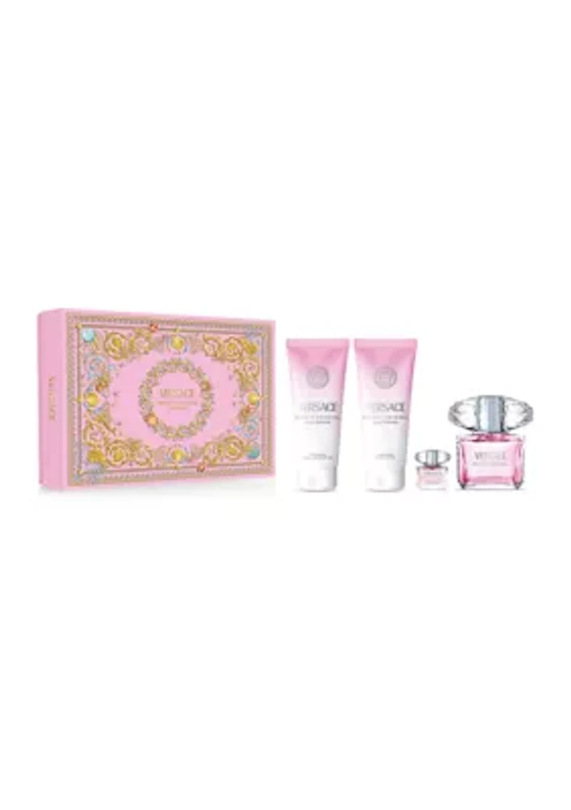 Discover the elegance of Versace Bright Crystal Eau de Toilette in this luxurious gift set. A fresh, floral blend of pomegranate, peony, and magnolia, balanced by warm amber and musk, this fragrance exudes sophistication and femininity. The perfect gift for someone special or a treat for yourself. SET INCLUDES: 3 OZ. EAU DE TOILETTE SPRAY, 3.4 OZ. PERFUMED BATH & SHOWER GEL, 3.4 OZ. PERFUMED BODY LOTION, 0.17 OZ. EAU DE TOILETTE DELUXE MINI Fragrance Family: Fruity, floral. Top Notes: Yuzu, Pomegranate, Water Mid Notes: Lotus Flower, Magnolia, Peony Base Notes: Musk, Mahogany, Amber Imported