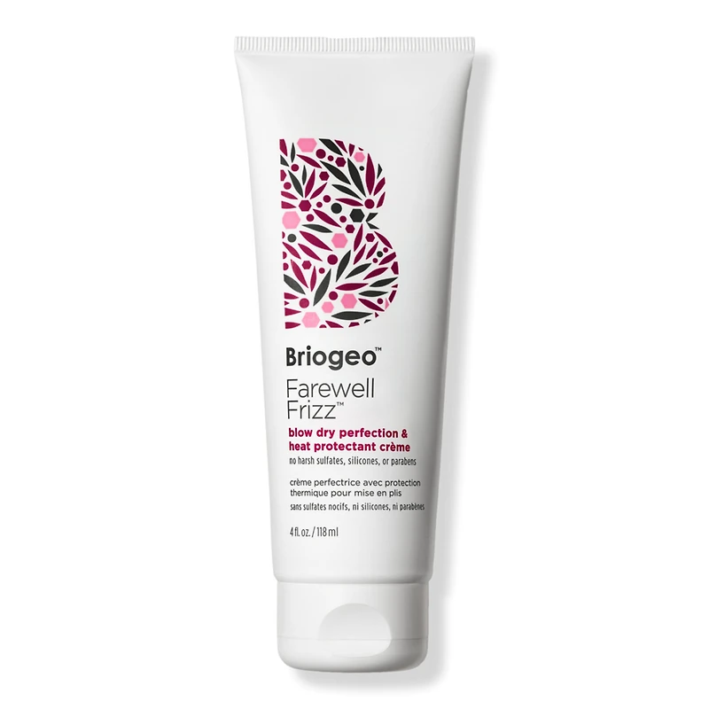 FAREWELL FRIZZ BLOW DRY CREME 4OZ. Benefits: Protects hair from heat styling up to 450 degrees F. Calms frizz, smooths hair, and enhances shine. Clean and naturally derived, formulated 6-free, and made with Briogeo proprietary NOVA Complex that locks in moisture and protects against humidity. Key Ingredients: Rosehip Oil: Protects the hair from free-radical damage, and provides essential fatty acids to help deter frizz and balance hair hydration. Argan Oil: Provides vitamin E and essential fatty acids to thoroughly condition and help address dryness, damage, and frizz. Coconut Oil: Helps seal in moisture, and protects against breakage, environmental impurities, and excess heat. :