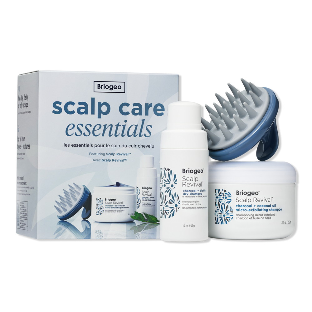 SCALP CARE ESSENTIALS. Benefits: Briogeo's gentle micro-exfoliating scalp scrub shampoo detoxifies and cleanses to help diminish scalp and hair buildup, flakes, and follicle congestion.. Briogeo's hand-held scalp massager helps increase circulation to support a healthy scalp.. Briogeo's non-aerosol, weightless dry shampoo blends easily and absorbs excess oil, extending the time between washes.. Key Ingredients: Binchotan charcoal - Helps detoxify hair and scalp by absorbing impurities and buildup. Microcrystalline cellulose - A plant-based dissolvable exfoliant that gently loosens buildup and flakes. Biotin - Nourishes and strengthens the hair and follicle. Clay, Tapioca + Rice Starch Complex - Absorbs excess oil to refresh and extend the time between wash days. Research Results: Clinically shown to reduce up to 82% of dry scalp flaking.*. Clinically shown to increase scalp hydration by up to 2X.*. 91% of users felt their scalp was less itchy after one use.*. 95% of users agree their scalp was less oily after one use.*.