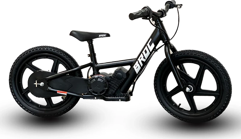 Kids can learn to ride in comfort with the BROC USA D12 Electric Bike With 12 in Wheels. Its motorcycle-style twist throttle is easy to grip, while the ergonomic seat adjusts as kids grow. The Innova tires with a BMX Tread design provide reliable traction and speed restrictions keep children moving at safe speeds.