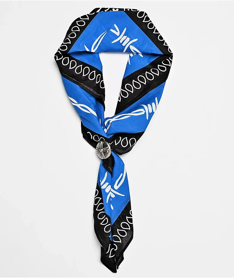 Broken Promises presents the black and blue bandana necklace with an alternative barbed wire pattern. A metallic ring embossed with a cross design holds the necklace together.