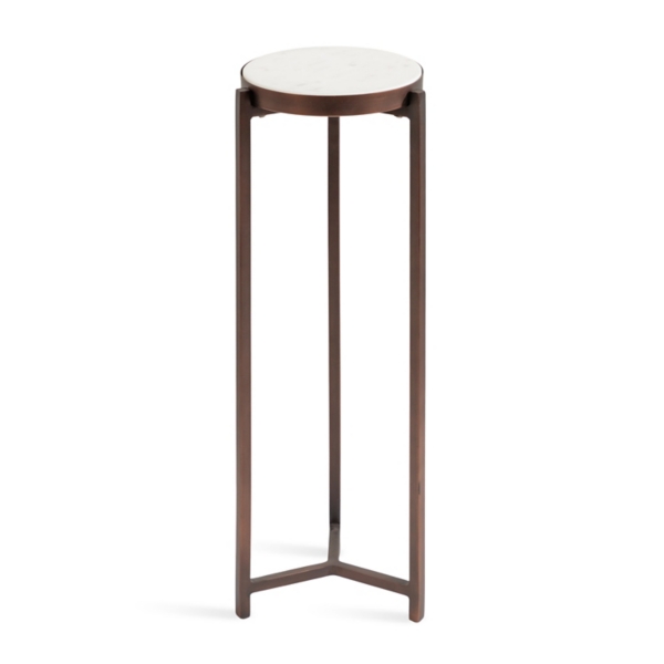 This Bronze Angular Marble Accent Table is a sophisticated accent piece that brings elevated style and glamor to any space in your home! Inspired by modern design, this pedestal table features a frame with clean, simple lines and a bronze finish. Accent table measures 23H x 9 in. in diameter Crafted of metal and authetic marble Satin bronze frame finish White marble tapletop finish Features an angular leg design Compact size Weight capacity: 7 lbs.; weighs 4.78 lbs. No assembly required Not intended for commercial use Care: Dust with a soft, dry cloth. This item is available at Kirklands.com only, not available in stores. Please note: this item cannot be shipped to APO/FPO addresses. WARNING: Cancer and Reproductive Harm - For more information go to www.P65Warnings.ca.gov .