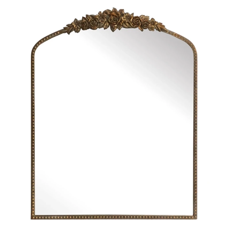 Embellish your walls with the timeless charm of this Bronze Derose Metal Arch Wall Mirror. Its antiqued finish and classic shape embraces a vintage beauty! Overall dimensions Width: 27.5 in. Depth: 2 in. Height: 35 in. Crafted of metal, resin, and mirror Bronze frame finish Arch shape Floral top design Beaded accents Hangs from back-mounted hardware Care: Dust with a soft, dry cloth. To clean mirror, spray a small amount of glass cleaner onto a lint-free cloth and wipe clean. Contact your local Kirkland's store for availability. Quantities and selection may vary by location. WARNING: Cancer and Reproductive Harm - For more information go to www.P65Warnings.ca.gov .