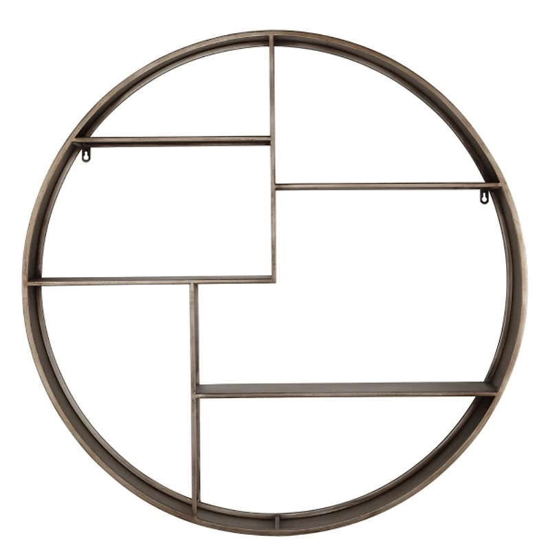 Spotlight your favorite knick knacks in industrial fashion with this Bronze Metal Round Frame Wall Shelf! The staggered, geometric style will complement any modern space. Wall shelf measures 6W x 36 in. in diameter Crafted of metal Bronze finish Staggered shelf design Features four (4) shelves Round shape Weight: 11.2 lbs. Hangs from back-mounted hardware Care: Dust with a soft, dry cloth. This item is available at Kirklands.com only, not available in stores. Please note: this item cannot be shipped to APO/FPO addresses. WARNING: This product can expose you to chemicals including nickel compounds which is known to the state of California to cause cancer and birth defects or other reproductive harm. For more information go to www.P65Warnings.ca.gov .