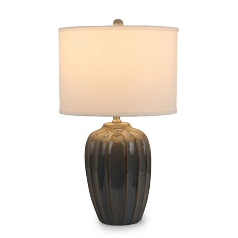 Give your console or side table a polished finishing touch with this Brook Blue Ceramic Table Lamp. Its dusty blue finish and understated style beautifully complements any interior! Lamp measures 24.5H in. Crafted of ceramic Blue finish with brown detailing Grooved base Hardback drum shade in white fabric Shade measures 10H x 14 in. in diameter Socket accommodates a 150, type A bulb Switch type: rotary switch on socket Features a 10 ft. plug-in cord Care: Dust with a soft, dry cloth. Do not exceed specified wattage. Contact your local Kirkland's store for availability. Quantities and selection may vary by location.
