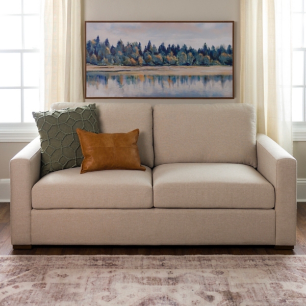 From everyday comfort to cozy nights in, our Brooks Sand Upholstered Sofa elevates your space with style and functionality. Its clean lines and neutral, durable upholstery is perfect for upgrading your living room, den, or entertainment area! Sofa measures 74.25W x 37D x 32H in.; seat height: 17 in. Crafted with a kiln-dried hardwood and engineered wood frame Upholstered in high-durability performance fabric and filled with high-density foam Sand upholstery finish Removable back cushions for double-sided use Corner-blocked joinery Weight: 80 lbs. Weight capacity: 500 lbs. No assembly required Not intended for commercial use Care: Spot clean. Contact your local Kirkland’s store for availability. Quantities and selection may vary by location.