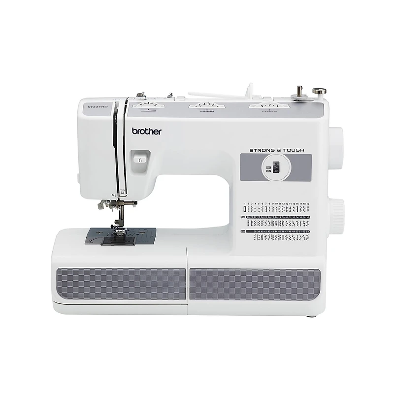 The Brother ST531HD Strong & Tough sewing machine is built to handle everything from lightweight silks to up to six layers of denim. It features a durable metal frame, a metal needle plate for smoother fabric feeding, heavy duty needles for thicker fabrics and a metal finger guard. Included are 53 unique built-in stitches, with blind hem, stretch, overcasting and decorative stitches, and an easy to use, one-step auto-size buttonhole. The ST531HD comes complete with six sewing feet, including a spring action zigzag foot, nonstick, blind stitch, zipper, buttonhole and button sewing feet. This machine also has a built-in easy needle threader, jam-resistant Quick-Set™ drop-in top bobbin, automatic bobbin winding system, a free arm for sewing cuffs and sleeves and an instructional DVD to get you started.Details:10.25" x 19" x 14.9" (26cm x 48.3cm x 37.8cm) machine dimensions53 unique built-in stitchesDurable metal frameSews through up to 6 layers of denimAutomatic needle threading systemAuto-size 1-step buttonholerEasy stitch selector and upper thread tension control dialsFree arm for sewing cuffs and sleevesJam-resistant Quick-Set top drop-in bobbinMetal finger guard and needle plateIncludes operation manual and DVDContents:ST531HD sewing machine6 quick-change presser feet: spring action zigzag, zipper, buttonhole, button sewing, blind stitch, nonstickFinger guard3 piece needle set: #11, #14, #16Twin needle4 bobbinsSpool pinFoot controllerPower cord