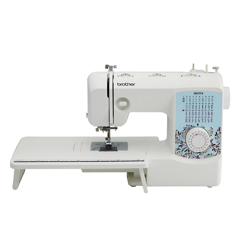 With a wide array of user-friendly features and lightweight design, the Brother XR3774 is perfect for both beginners learning to sew and more advanced sewers looking for versatility. Built into this full-featured model are 37 built-in stitches, including a blind hem, decorative and quilting stitches. It also features an automatic one-step buttonholer for virtually perfect buttonholes and a wide table for large-scale projects such as quilts. Included are eight sewing feet, including a buttonhole, zipper, zigzag, blind stitch, button sewing, narrow hemmer, walking and quilting feet. Enjoy the ease of sewing cuffs, sleeves, and pant legs with the built-in free arm. Designed for ease of use, the XR3774 also has a built-in easy needle threader, jam-resistant Quick-Set top drop-in bobbin, and an automatic bobbin winding system. Expand your creative potential with this easy to use, flexible machine!Details:12" x 5.8" x 15.3" (30.5cm x 14.7cm x 38.9cm) machine dimensions37 unique built-in stitches with 74 stitch functionsBrightly lit LED work areaAutomatic needle threading systemFree arm for sewing cuffs and sleevesJam-resistant quick-set top drop-in bobbinEasy stitch selectorIncludes operation manual and DVDContents:XR3774 sewing and quilting machineWide table8 accessory feet: zigzag, zipper, buttonhole, button sewing, blind stitch, walking, spring action quilting and narrow hemDarning plateTwin needle4 bobbinsExtra spool pinScrewdriverPower cord