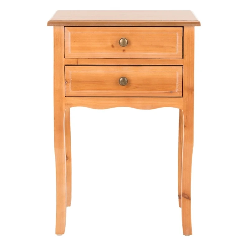 The gentle, scalloped detail and subtle cabriole legs of this Brown 2-Drawer Mika Traditional Accent Table bring a farmhouse charm to any decor. The graceful frame and warm finish give it the appearance of a well loved heirloom. Overall dimensions Width: 18.1 in. Depth: 13 in. Height: 26.8 in. Crafted of pine wood Natural brown finish Features two (2) drawers Scalloped apron Bronze drawer handles Weight: 15.4 lbs. Weight capacity: 30 lbs. No assembly required Not intended for commercial use Care: Dust with a soft, dry cloth. This item is available at Kirklands.com only, not available in stores. Please note: this item cannot be shipped to APO/FPO addresses.