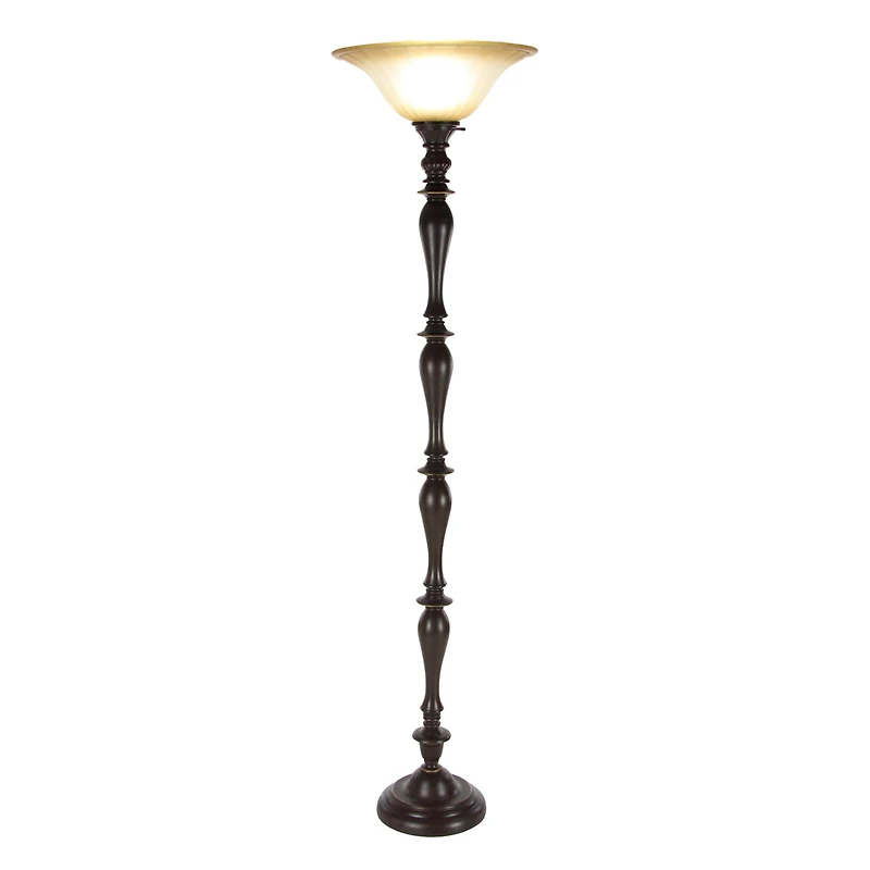 Bring light and sophistication to any corner of a room with this torchiere at 72” tall, this floor lamp will always grab attention. Its brown body features a series of curved designs and is topped with a tempered glass bowl that gives off a warm, gentle glow when the lamp is on. The on off knob sits just below the glass head. The torchiere best complements a traditional style room. Uses one standard A type light bulb (not included). Cord length measures 72". Suitable for indoor use only. Easy on and off twist switch located next to glass shade. This item comes shipped in one carton. Traditional style.