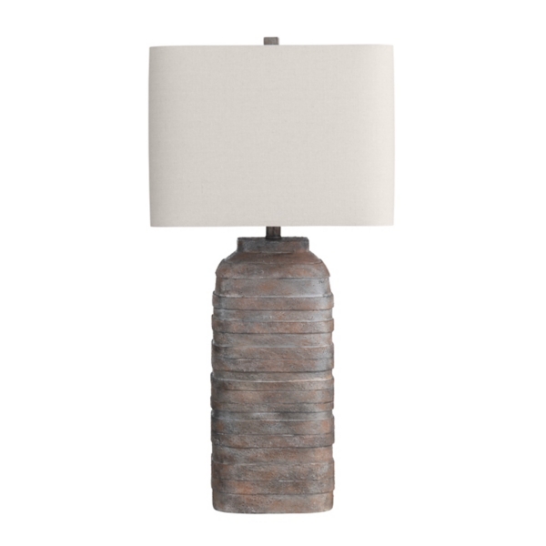 With a weathered finish and robust texture, this Brown Textured Rectangle Shade Table Lamp will make the perfect addition to any coastal or rustic farmhouse decor! Lamp measures 30.5H in. Crafted of resin Rustic brown finish Tall base with a ridged texture Hardback oval shade in oatmeal fabric Shade measures 10.5H x 15 in. in diameter Socket accommodates a 150-watt, type-A bulb 3-way switch Features a clear, plug-in cord Care: Dust with a soft, dry cloth. Do not exceed specified wattage. This item is available at Kirklands.com only, not available in stores. Please note: this item cannot be shipped to APO/FPO addresses.