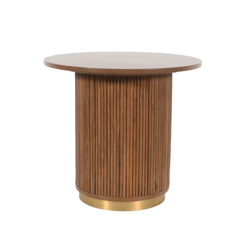 Experience elegance and functionality with this Brown Wood and Brass Moderna Accent Table! Perfect for small spaces, this table also offers functionality with a stylish touch. Table measures 20H x 22 in. in diameter Crafted of mango wood Brown finish Fluted design Accented with a brass wrought iron base Weight:27 lbs. Weight capacity: 250 lbs. Assembly required Not intended for commercial use Care: Wipe with a soft, dry cloth. This item is available at Kirklands.com only, not available in stores. Please note: this item cannot be shipped to APO/FPO addresses.