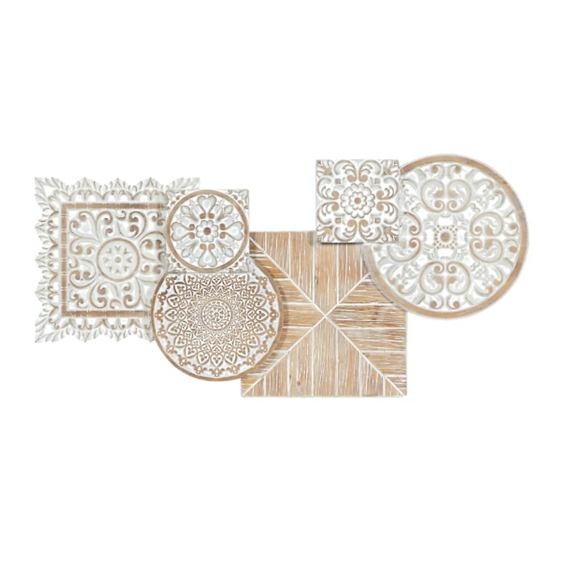 The Brown Wood Geometric Layered Shapes Wall Plaque is sure to dress up your walls with playful, rustic charm. Style this distressed statement piece with any farmhouse or cottage décor! Plaque measures 35.5L x 2W x 17H in. Crafted of wood Whitewashed wood finish Rustic brown wood finish Features layered geometric plate design Accented with carved plate designs Hues of white, tan, and brown Weight: 5.5 lbs. Hangs from back-mounted hardware Care: Dust with a soft, dry cloth. This item is available at Kirklands.com only, not available in stores. Please note: this item cannot be shipped to APO/FPO addresses. WARNING: Cancer and Reproductive Harm - For more information go to www.P65Warnings.ca.gov .