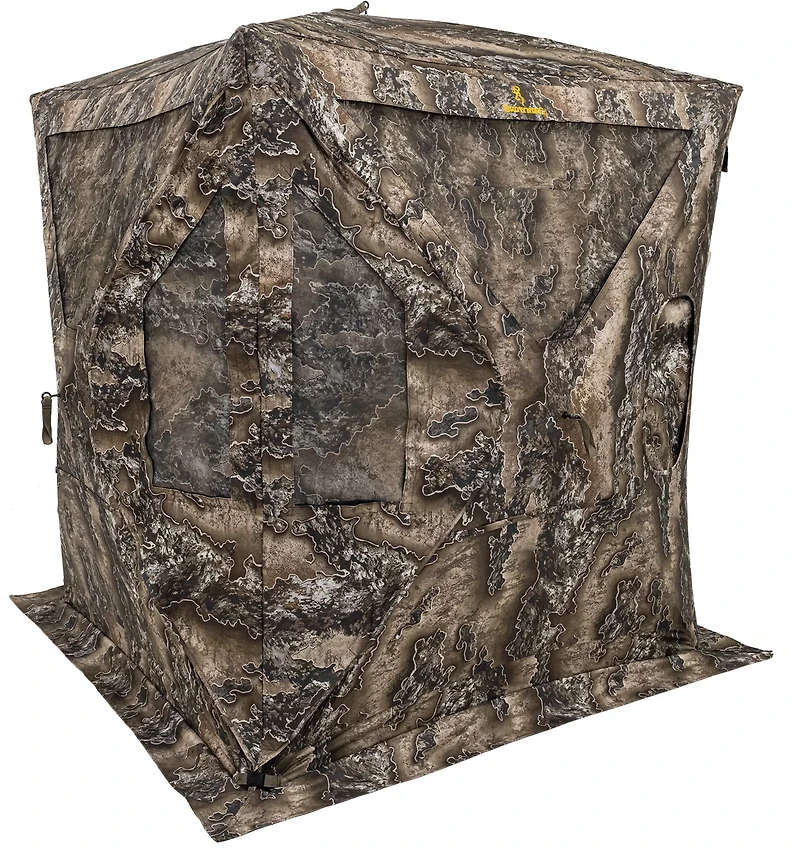 Disguise your hunting spot with the Browning Evade Hunting Blind. The durable fabric features a camouflage print and blackout backing for concealment. The SILENT-TRAC window system features limitless viewing positions with durable shoot-through mesh to hide your movements.
