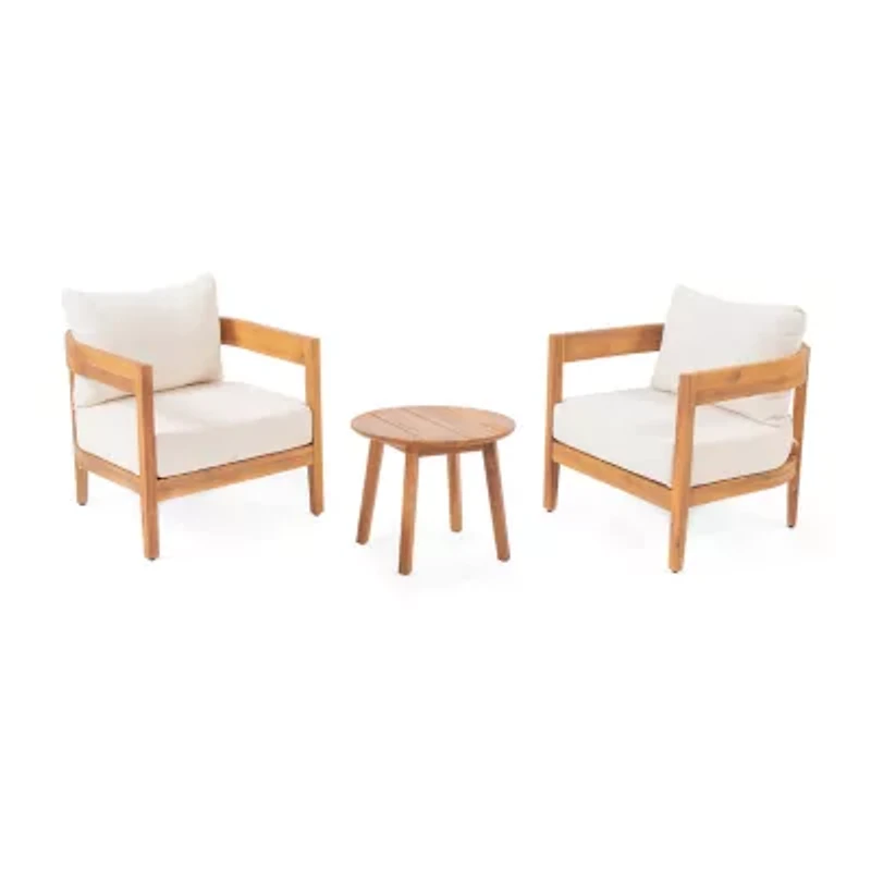 Enjoy an oasis of relaxation in your own backyard space with a chat set that brings both style and comfort. With lovely acacia wood frames and classic slat paneling, this set highlights both assuring durability and incredible style for all to enjoy. This set features a lovely tub shape that is topped with plush water-resistant cushions that make your outdoor lounging one of luxurious comfort. Perfect for a cozy conversation or a refreshing drink, this set will quickly become your new favorite outdoor spot to unwind.