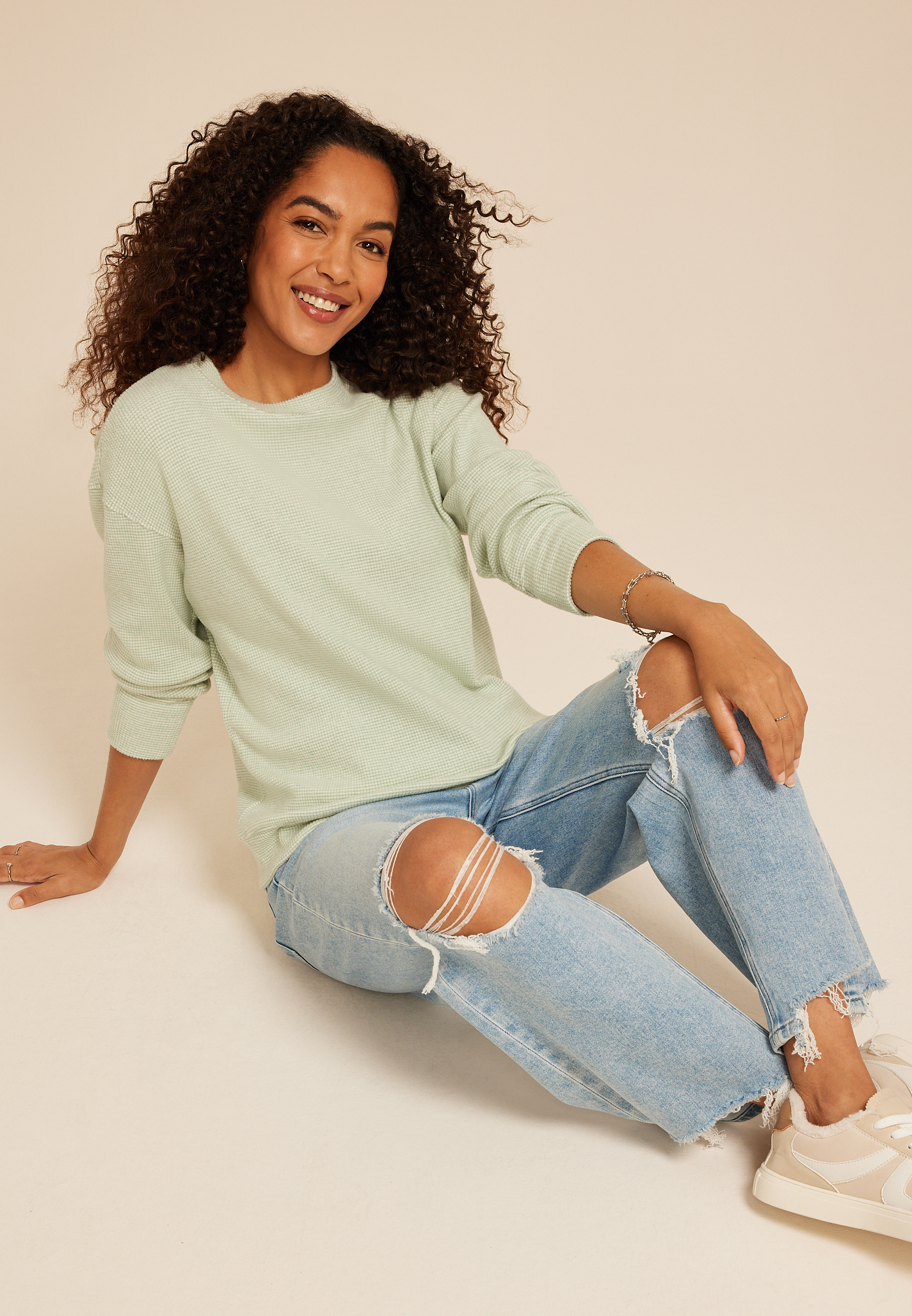 Fall in love with the soft embrace of our Brushed Waffle Tunic Sweatshirt. Its delicate waffle texture and brushed finish feels like a gentle hug, while the relaxed tunic length drapes beautifully for a look that’s both cozy and chic. It's perfect for crisp mornings or quiet evenings at home. Pair it with your favorite denim or leggings and make every moment feel like a warm embrace.