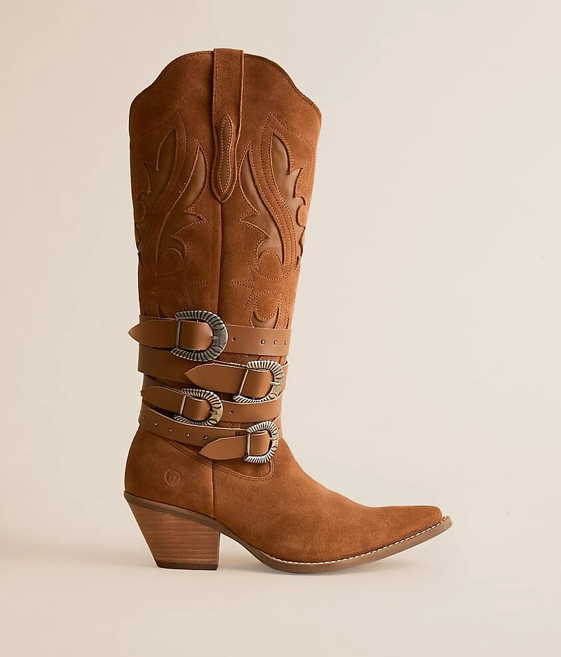 Embroidered suede pull-on cowboy boot Adjustable belt details Cushioned footbed 15" shaft, snip toe 14" calf circumference 2 1/2" heel