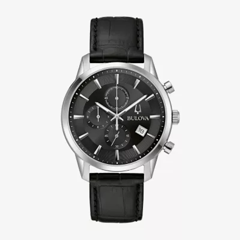 Timeless design and modern functionality define this new 6-hand Bulova men’s chronograph from the sutton collection. A sophisticated silver-tone stainless steel case with a blend of brushing and polishing features classically styled chronograph pushers and a domed mineral crystal. An elegant black dial features applied hour markers against a circular grooved track, luminescent hour and minute hands, and a date display. The chronograph can time events up to 12 hours to the nearest second. Perfectly paired with a black crocodile grain leather strap with a matching silver-tone stainless steel deployant clasp. This new Bulova men’s timepiece from the sutton collection will have you looking your best for every occasion.