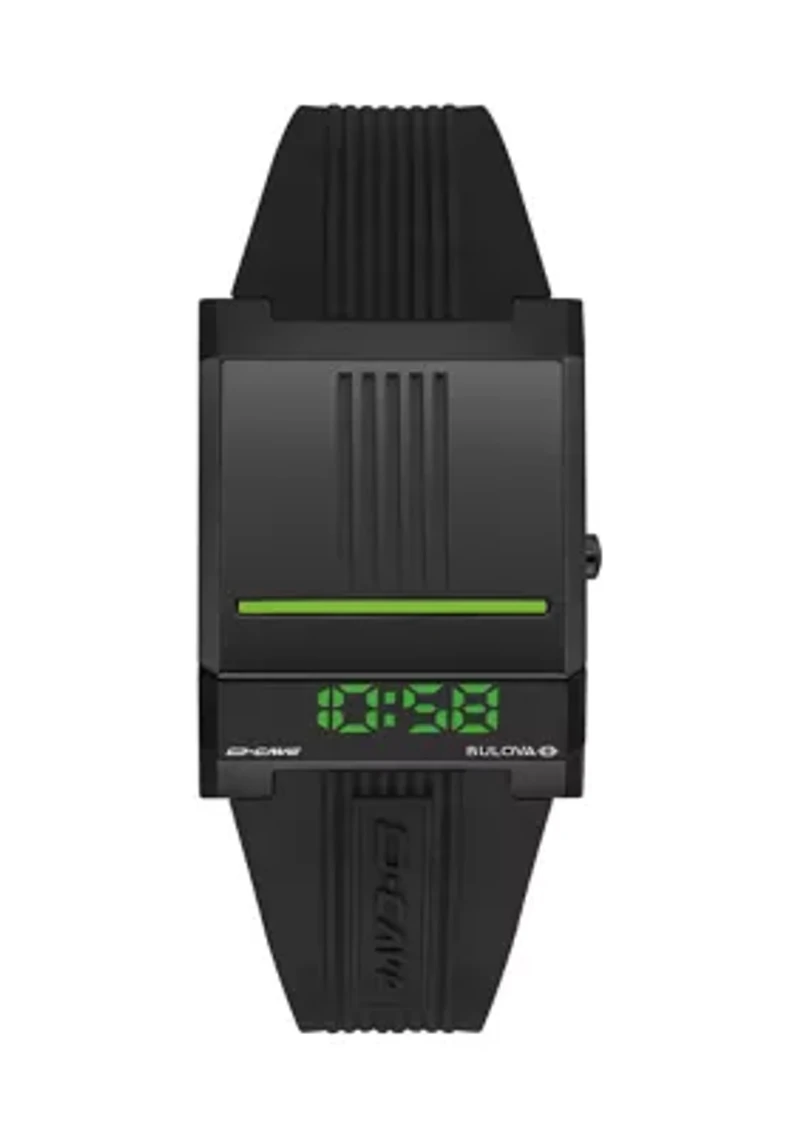Next-level style is winning – in an exclusive collaboration with D-Cave, the live gaming leader, and Bulova, the innovator of fine watches. Our new Computron D-Cave is the ultimate watch for gamers and enthusiasts alike. The iconic, futuristic design is inspired by the gaming culture and features a sleek black IP stainless steel case with luminous green accents on a black silicone strap with 3-piece buckle and a green LED time display with dual time zone capabilities. This iconic timepiece from the 1970’s becomes the essential watch to up your style game with D-Cave in the digital age. Presented in a special box with D-Cave design elements. Buckle closure Digital dial Quartz movement Satin finish Illuminated display Warranty available, Limited liability warranty, 3 years Imported Product Specifications 3.5-in X 2-in X -in 31mm Material & Care Rubber, Stainless steel Clean with a soft bristle brush and warm soapy water.