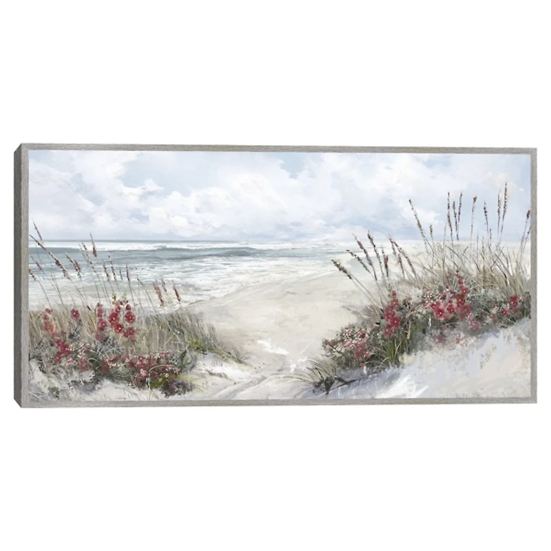 With crimson flowers dotting coastal grasses, this Burgandy Shores Framed Canvas Art Print evokes seaside charm. It makes a blissful addition to any wall! Overall dimensions Width: 49 in. Depth: 1.5 in. Height: 25 in. Printed on stretched, polycotton blend canvas Gray frame around wrapped canvas Features a coastal subject Hues of gray, white, red, blue, and green Weight: 10 lbs. Hangs from back-mounted hardware; sawtooth hangers included Care: Dust with a soft, dry cloth. Avoid direct sunlight and heat sources. This item is available at Kirklands.com only, not available in stores. Please note: this item cannot be shipped to APO/FPO addresses.