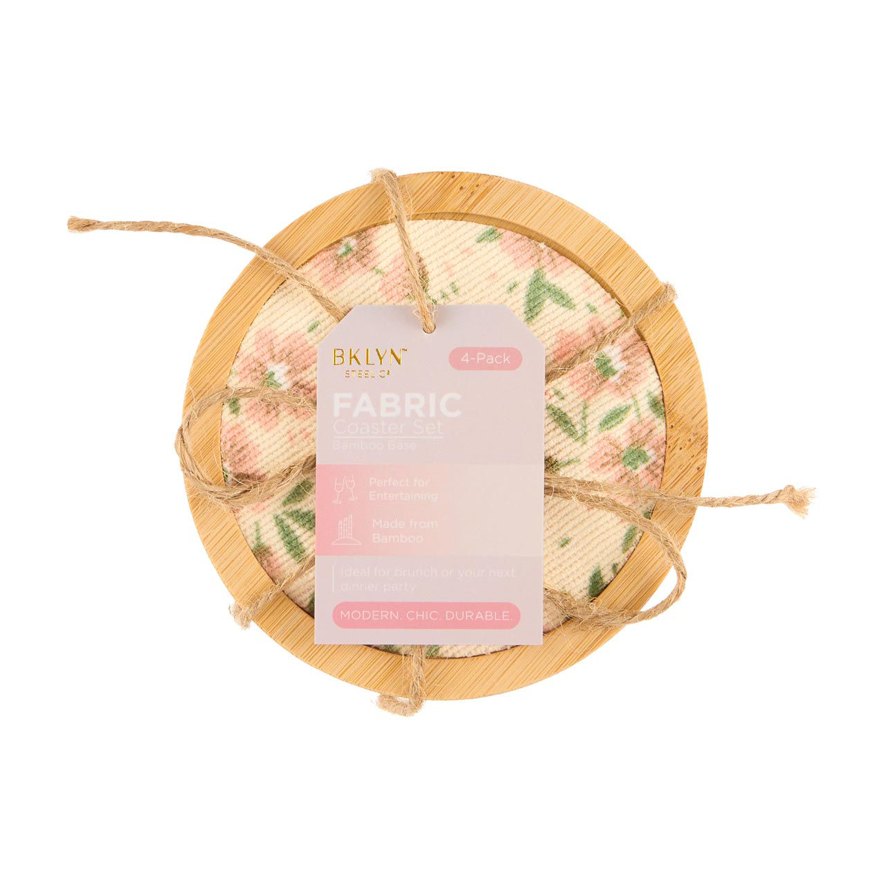 Elevate your entertaining experience with the charming BYLKN Steel Co Bamboo & Fabric Coaster set, featuring a delicate floral design. These coasters are a perfect blend of style and functionality, offering protection for your surfaces while adding a touch of elegance to your home decor.
