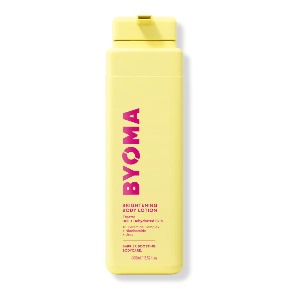 BRIGHTENING BODY LOTION 13.5OZ. Benefits: A brightening lightweight body lotion for radiant, hydrated skin. Proprietary Tri-Ceramide Complex strengthens skin barrier. Urea and Niacinamide improve skin's tone and texture. Lightweight, silky texture absorbs instantly. Dermatologist tested & approved. Alcohol & fragrance-free. Gentle enough for daily use. Recyclable bottles. Features: Featuring BYOMA's unique Tri-Ceramide Complex and a blend of skin-compatible Urea and Niacinamide to brighten skin and improve hyperpigmentation, this fast-absorbing lotion effectively hydrates and replenishes moisture levels with each use.. Key Ingredients: Tri-Ceramide Complex: Formulated with the three essential lipids of the stratum corneum ceramides, cholesterol + fatty acids- to rebuild your skin barrier. Niacinamide: Brightens and balances skin. Urea: smooths texture and brightens skin.