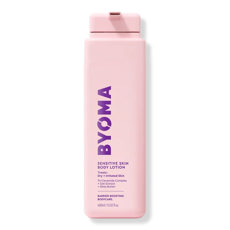 SENSITIVE BODY LOTION 13.5OZ. Benefits: A sensitive body lotion to deeply soothe extremely dry, irritated skin. Proprietary Tri-Ceramide Complex strengthens skin barrier. Colloidal Oat Extract and Shea Butter help soothe inflammation. Calming, buttery soft, fragrance-free formula. Dermatologist tested & approved. Alcohol & fragrance-free. Gentle enough for daily use. Recyclable bottles. Features: Enriched with BYOMA's unique Tri-Ceramide Complex, Colloidal Oat Extract and Shea Butter to support barrier function and deliver anti-inflammatory results, leaving skin soft, smooth and supple and relieved from itching or discomfort.. Key Ingredients: Tri-Ceramide Complex: Formulated with the three essential lipids of the stratum corneum - ceramides, cholesterol + fatty acids - to help rebuild your barrier. Oat Extract: Soothes, softens and smooths skin. Shea Butter: An emollient which soothes, nourishes and hydrates.