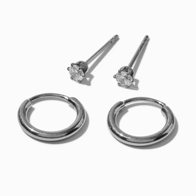 C LUXE by Claire's Silver-tone Titanium Cubic Zirconia Studs & Clicker Hoop Earrings - 2 Pack