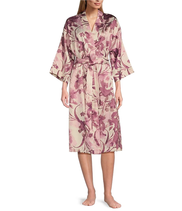In Bloom By Jonquil Floral Print 3/4 Sleeve Satin Coordinating Short Wrap Robe
