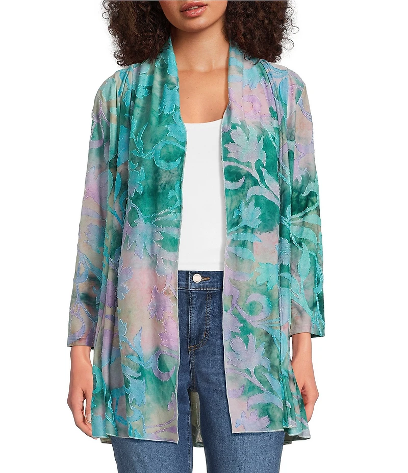 Calessa Burnout Tie-Dye Drape Front Bracelet Length Sleeve Open Front Cardigan