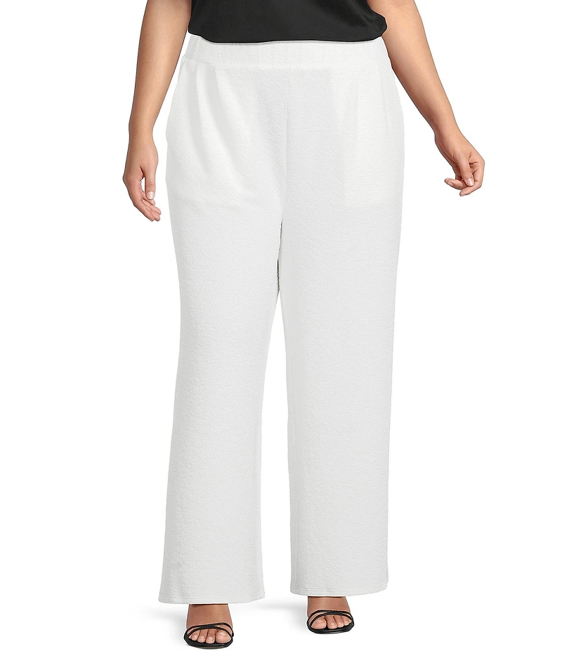 From Calessa Plus, these pants feature: Textured knit fabrication Wide leg silhouette Elastic waistband Straight hem Pull-on construction  Approx. 32" inseam Polyester/spandex Hand wash cold/line dry Imported.