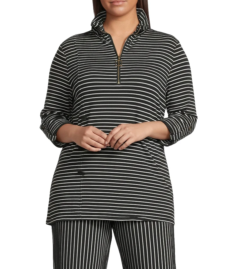 Calessa Plus Size Textured Yarn-Dye Knit Wire Collar 3/4 Roll-Tab Sleeve Quarter Zip-Up Tunic