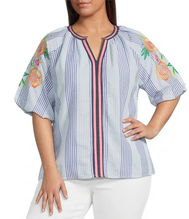 Calessa Plus Size Woven Stripped Embroidered Split V-Neck Elbow Length Balloon Sleeve Tunic