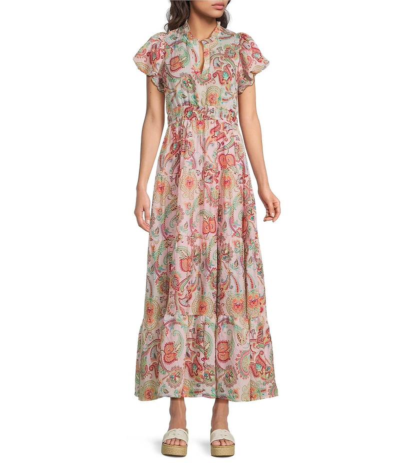 Calessa Vine Floral Split V-Neck Short Puff Sleeve Tiered A-Line Midi Dress