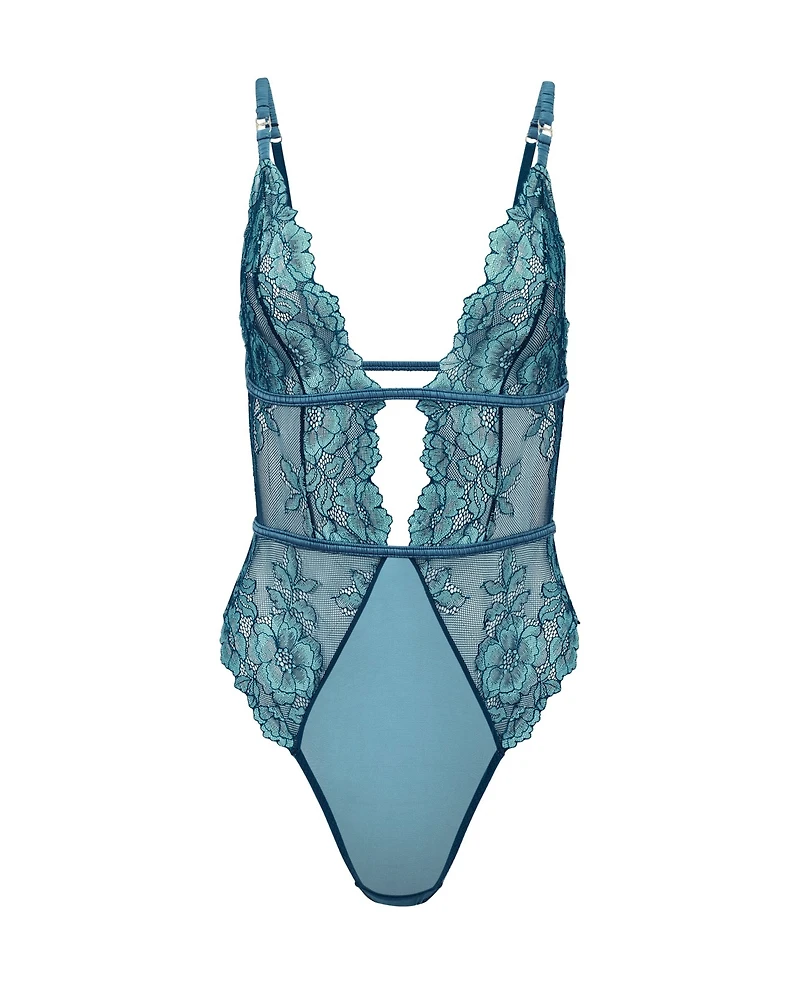 This beautiful Calissa lace bodysuit features soft unlined triangle cups, a plunge V-neck, and delicate strappy details in the back. The delicate lace and mesh make this a romantic and sexy piece that you'll want to show off. (Available in plus-sizes 1X-4X.)