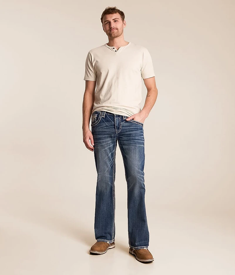 Slim fit bootcut jean Comfort stretch fabric Low rise, 18" bottom opening Embroidered blowout flap back pockets Zip fly