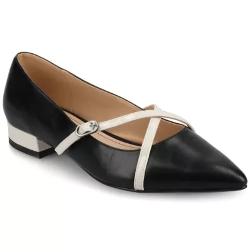 The Camby dress flat from Journee features elegant crisscross straps with a chic buckle, adding a refined touch to its slip-on design. With a pointed toe and 1-inch block heel, this faux leather flat offers sophistication and comfort. The cushioned footbed ensures lasting comfort, making it perfect for work and casual wear. Also available in wide width. Slip-on Padded insole China Imported Product Specifications 1 in Flat W Material Synthetic polyurethane