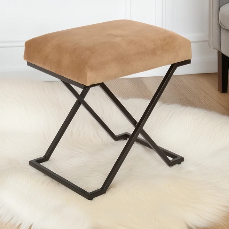 Elevate your space with this sleek and stylish Camel Faux Leather Stool! Whether used as extra seating, a chic footrest, or a statement accent piece, this versatile stool brings both function and flair to your living room, bedroom, or entryway. Stool measures 17.75L x 14W x 19H in. Crafted of metal Upholstered in tan faux leather and filled with high-density foam Bronze metal finish Features an X base design Weight: 4.2 lbs. Weight capacity: 225 lbs. No assembly required Not intended for commercial use Care: Spot clean. Contact your local Kirkland's store for availability. Quantities and selection may vary by location.
