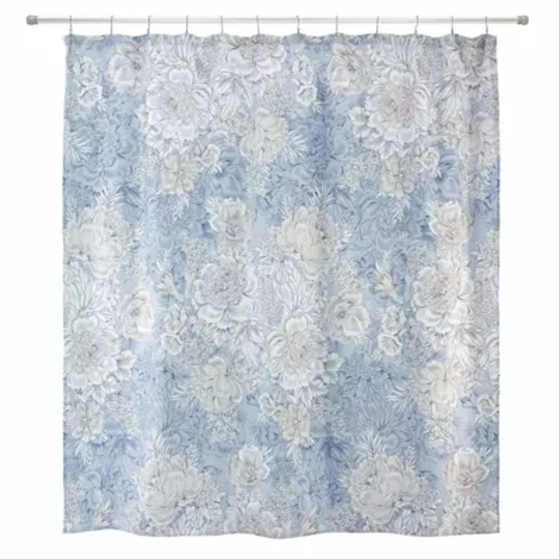The Nicole Miller Camille Decorative Shower Curtain features a large scale floral print with beige and brown flowers popping from a periwinkle blue base. Beautifully printed on a textured 100% polyester cloth for easy care and brilliant colors. Coordinating towels, rugs and other pieces of bath accessories available. This beautifully glazed floral pattern adds a sense of calm, charm, and beauty to any bathroom. Floral Imported Product Specifications 72-in. x 72-in. Material & Care Polyester Machine washable, gentle cycle