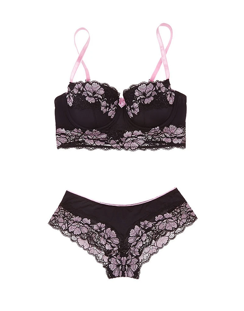 The Candi matching bra and panty set is a romantic and sexy take on the classic black lingerie set. With a balconette-style contour bra and hipster-cut panties made from delicate lace, this set is sure to turn up the heat in the bedroom. (Available in sizes 30B-38DD.)