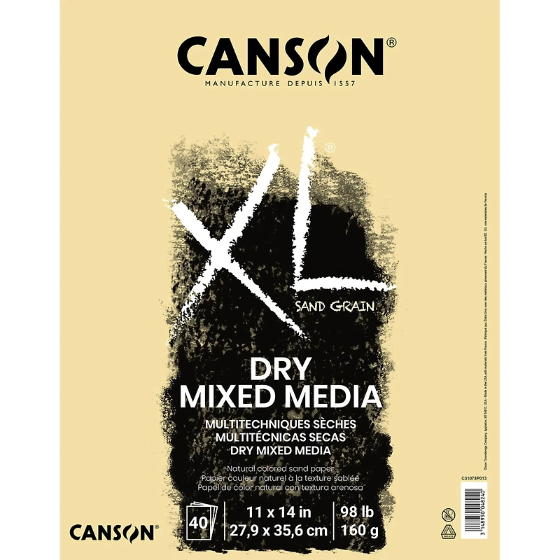 Ideal for drawing and sketching with graphite, colored pencil, pastel, and charcoal, Canson XL Sand Grain Dry Mixed Media Pads feature an innovative paper made from organic, renewable materials for a textured sand grain finish. Easy to erase, sheets can be used on both sides and retain pigment beautifully, allowing for the creation of subtle color effects. Bound on the short side, these tape-bound pads contain 40 sheets of 98 lb (160 gsm) paper. Details: Natural brown 11" x 14" sheet size 98lb/160gsm 40 sheets Tape boundSand grain finishFor use with graphite, colored pencil, pastel and charcoal